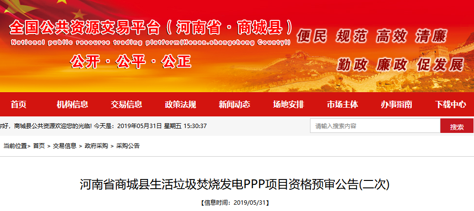 中國環(huán)聯(lián)網(wǎng)獲悉,5月31日,河南省商城縣生活垃圾焚燒發(fā)電PPP項(xiàng)目發(fā)布資格預(yù)審公告(二次)。項(xiàng)目概況及采購內(nèi)容項(xiàng)目名稱:河南省商城縣生活垃圾焚燒發(fā)電PPP項(xiàng)目;采購編號:商財(cái)采招字(2018)-147號;采購方式:公開招標(biāo) ;建設(shè)內(nèi)容:建設(shè)一座生活垃圾焚燒發(fā)電,一期工程規(guī)模600噸/日,配套一期工程...