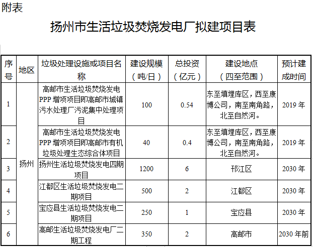 日前揚州市人民政府公示了《揚州市生活垃圾焚燒發(fā)電廠擬建項目表》,共6個項目,總投資11.94億元,具體內(nèi)容如下:為貫徹國家發(fā)展改革委等五部委關(guān)于《關(guān)于進一步做好生活垃圾焚燒發(fā)電廠規(guī)劃選址工作的通知》(發(fā)改環(huán)資規(guī)〔2017〕2166號)精神,提升揚州環(huán)境質(zhì)量,提高全市生活垃圾無害化處理能力和資源循環(huán)利...