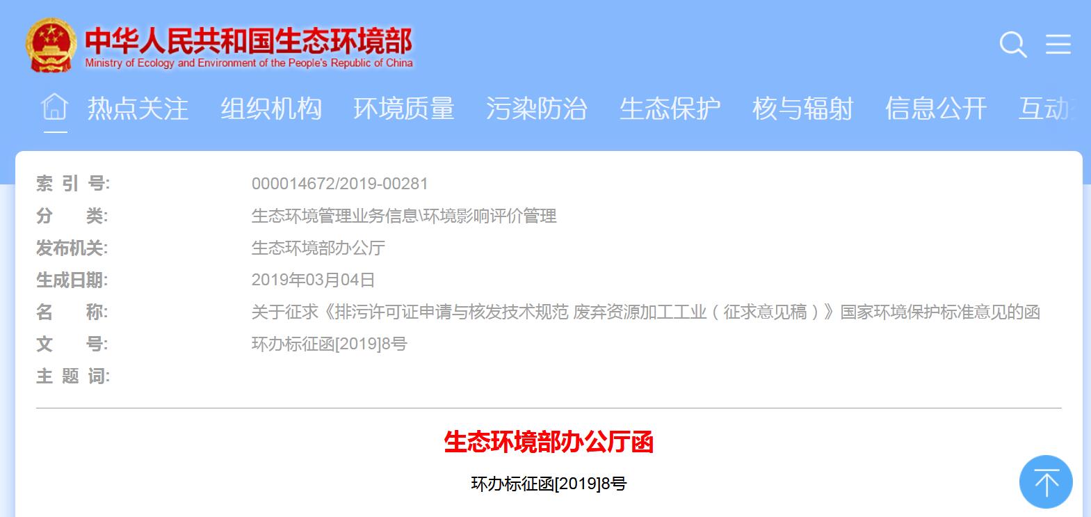 關(guān)于征求《排污許可證申請(qǐng)與核發(fā)技術(shù)規(guī)范 廢棄資源加工工業(yè)(征求意見稿)》國家環(huán)境保護(hù)標(biāo)準(zhǔn)意見的函生態(tài)環(huán)境部辦公廳函環(huán)辦標(biāo)征函[2019]8號(hào)關(guān)于征求《排污許可證申請(qǐng)與核發(fā)技術(shù)規(guī)范 廢棄資源加工工業(yè)(征求意見稿)》國家環(huán)境保護(hù)標(biāo)準(zhǔn)意見的函各有關(guān)單位:為落實(shí)《國務(wù)院辦公廳關(guān)于印發(fā)控制污染物排放許可制實(shí)施...