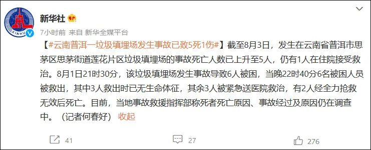8月1日普洱市思茅區(qū)蓮花片區(qū)垃圾填埋場(chǎng)發(fā)生事故致6人被困目前事故死亡人數(shù)已上升至5人# 事件經(jīng)過(guò) #8月1日21時(shí)30分,普洱市思茅區(qū)相關(guān)部門接到報(bào)警,思茅街道蓮花片區(qū)垃圾填埋場(chǎng)有人被困。事故發(fā)生后,市委、市政府和思茅區(qū)委、區(qū)政府高度重視,市區(qū)兩級(jí)迅速成立“8.01”事故救援指揮部進(jìn)行現(xiàn)場(chǎng)緊急救援。...
