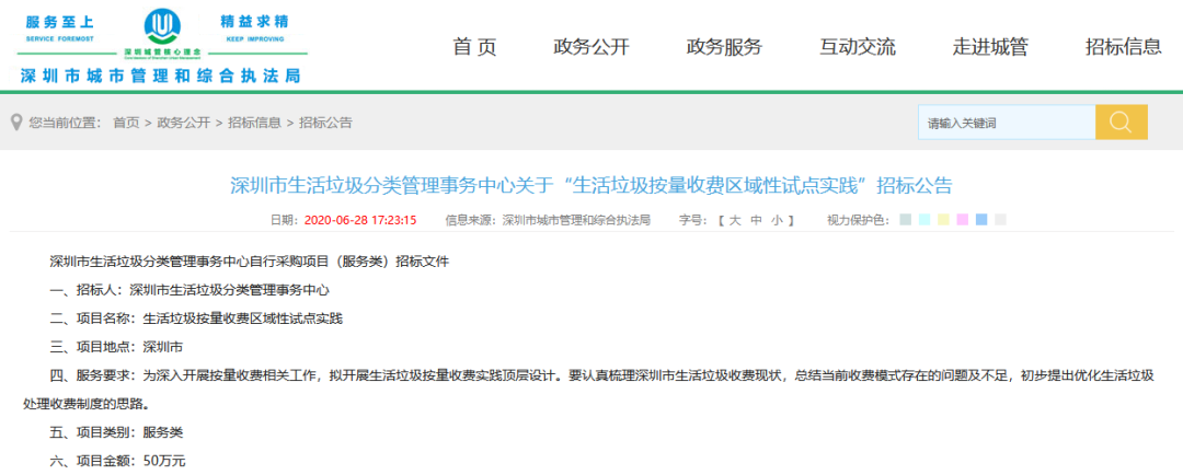 文章導(dǎo)讀6月,深圳市啟動(dòng)“生活垃圾按量收費(fèi)區(qū)域性試點(diǎn)實(shí)踐項(xiàng)目”公開招標(biāo)。按計(jì)劃,中標(biāo)人將于12月10日提交項(xiàng)目成果。9月1日,有著里程碑式意義的《深圳市生活垃圾分類管理?xiàng)l例》開始實(shí)施,宣告深圳垃圾分類進(jìn)入法治強(qiáng)制時(shí)代。《條例》授權(quán)深圳市人民政府按照“誰產(chǎn)生誰付費(fèi)和差別化收費(fèi)”的原則,逐步建立計(jì)量收費(fèi)...