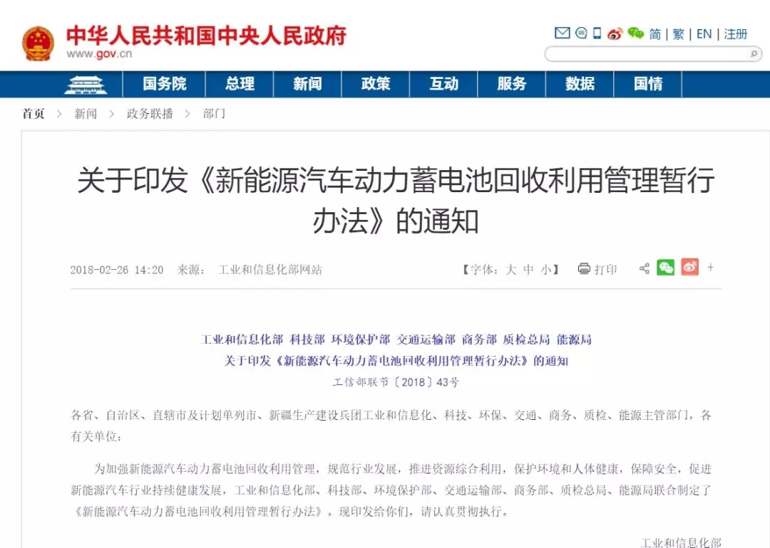 2月26日,工業(yè)和信息化部、科技部、環(huán)境保護(hù)部、交通運(yùn)輸部、商務(wù)部、質(zhì)檢總局、能源局印發(fā)《新能源汽車動(dòng)力蓄電池回收利用管理暫行辦法》的通知,旨在加強(qiáng)新能源汽車動(dòng)力蓄電池回收利用管理,規(guī)范行業(yè)發(fā)展。來源:工信部官網(wǎng)通知提出,汽車生產(chǎn)企業(yè)應(yīng)建立動(dòng)力蓄電池回收渠道,負(fù)責(zé)回收新能源汽車使用及報(bào)廢后產(chǎn)生的廢舊...
