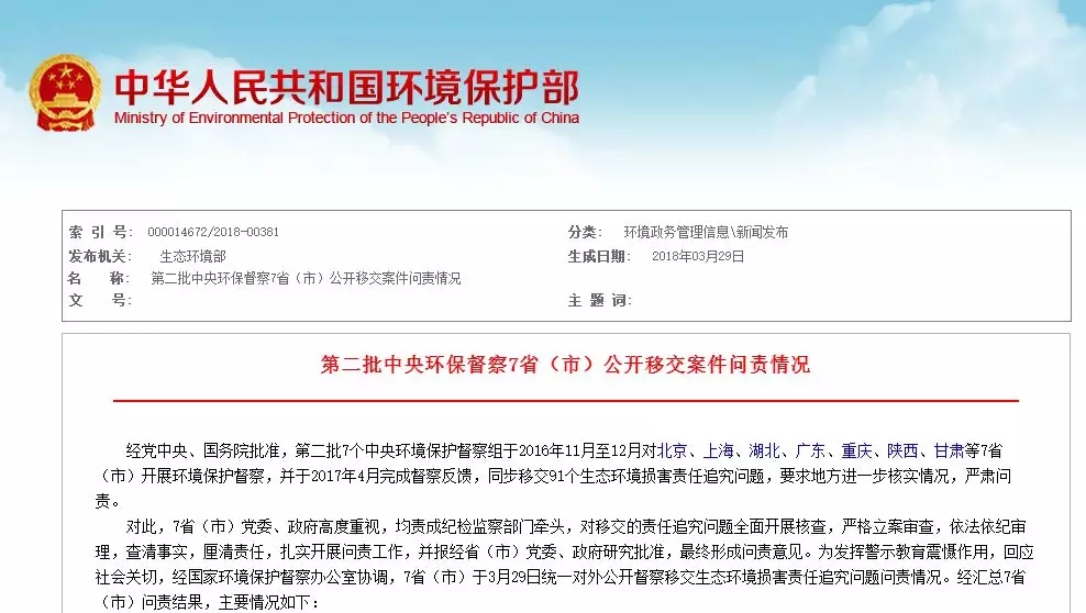 經(jīng)黨中央、國務(wù)院批準(zhǔn),第二批7個(gè)中央環(huán)境保護(hù)督察組于2016年11月至12月對北京、上海、湖北、廣東、重慶、陜西、甘肅等7?。ㄊ校╅_展環(huán)境保護(hù)督察。3月29日,北京、上海、湖北、廣東、重慶、陜西、甘肅等7?。ㄊ校ν夤_了第二批中央環(huán)保督察移交生態(tài)環(huán)境損害責(zé)任追究問題問責(zé)情況。七省市共問責(zé)1048人...
