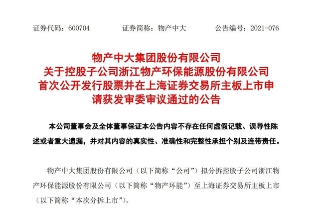 2021年9月30日,物產(chǎn)中大發(fā)布關(guān)于控股子公司浙江物產(chǎn)環(huán)保能源有限公司首次公開發(fā)行股票,并在上海證券交易所主板上市申請獲發(fā)審委審議通過的公告。 公告顯示,物產(chǎn)中大集團(tuán)股份有限公司(以下簡稱“公司”)擬分拆控股子公司浙江物產(chǎn)環(huán)保能源股份有限公司(以下簡稱“物產(chǎn)環(huán)能...