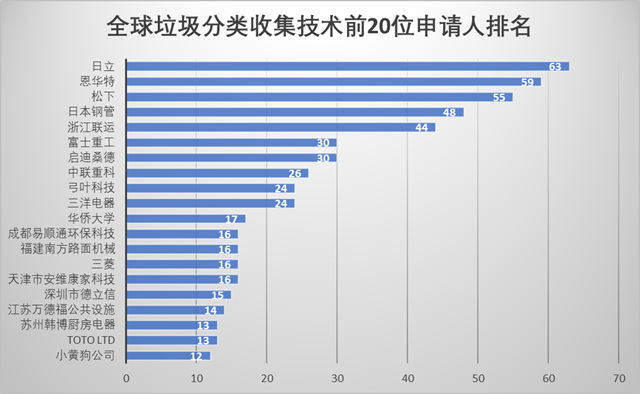 在全球垃圾收集分類領(lǐng)域?qū)@暾埩颗琶?0的申請人中,日立作為世界五百強綜合跨國集團(tuán)在多個領(lǐng)域處于行業(yè)領(lǐng)先地位,與專注于垃圾處理技術(shù)并發(fā)明了第一套自動垃圾收集系統(tǒng)的瑞典恩華特并駕齊驅(qū),緊隨其后的是另一家世界五百強企業(yè)松下。浙江聯(lián)運、啟迪桑德、以及成立于2018年并致力于將人工智能和大數(shù)據(jù)技術(shù)應(yīng)用于垃...
