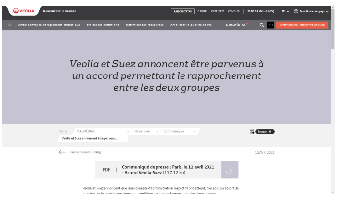 威立雅和蘇伊士宣布,昨晚(4月12日)各自的董事會(huì)原則上就兩集團(tuán)合并的主要條款和條件達(dá)成協(xié)議。兩家公司以每股Suez股份20.50歐元的價(jià)格(附息票)為條件達(dá)成協(xié)議。 該協(xié)議將從工業(yè)和社會(huì)的角度出發(fā),創(chuàng)建新的蘇伊士公司,該公司的資產(chǎn)由一個(gè)連貫的,可持續(xù)的部門(mén)組成,并具有真正的增長(zhǎng)潛力,營(yíng)業(yè)額約為70...