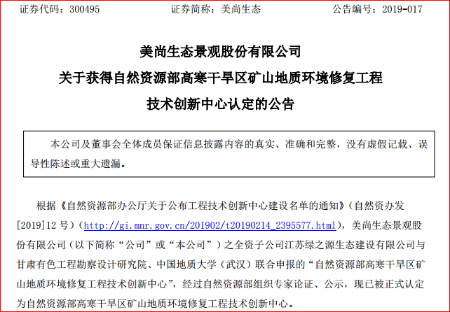 2019年2月18日,美尚生態(tài)景觀股份有限公司(簡稱“美尚生態(tài)”)發(fā)布公告,公司全資子公司江蘇綠之源生態(tài)建設(shè)有限公司與甘肅有色工程勘察設(shè)計(jì)研究院、中國地質(zhì)大學(xué)(武漢)聯(lián)合申報(bào)的“自然資源部高寒干旱區(qū)礦山地質(zhì)環(huán)境修復(fù)工程技術(shù)創(chuàng)新中心”,經(jīng)過自然資源部組織...
