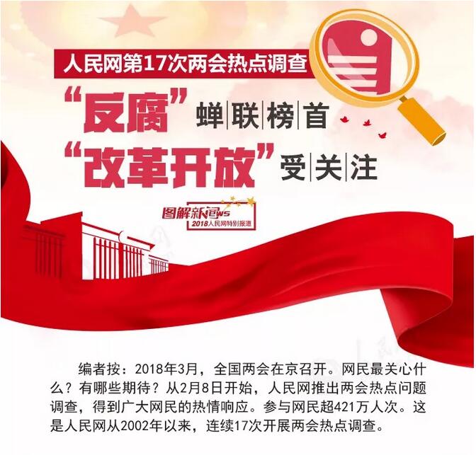2018年3月,全國(guó)兩會(huì)將在北京召開,網(wǎng)民最關(guān)心什么?有哪些期待?而隨著的頻繁出臺(tái),人民對(duì)碧海藍(lán)天的渴望更加強(qiáng)烈,問題也愈發(fā)引起人民的關(guān)注。人民網(wǎng)推出的兩會(huì)熱點(diǎn)調(diào)查中,“環(huán)境保護(hù)”進(jìn)入前十名榜單,成為備受關(guān)注的熱點(diǎn)問題,而且其于2014-2018年五次上榜。 來源:人民網(wǎng)圖解新聞