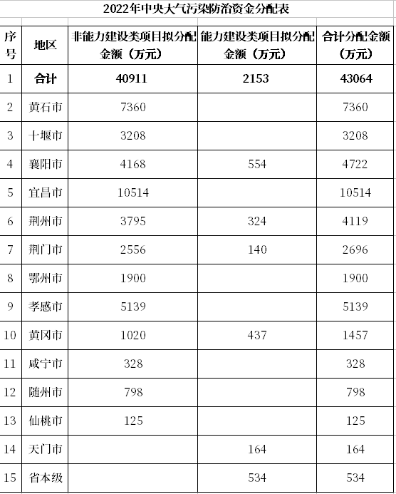 2022年4月14日,湖北省財(cái)政廳發(fā)布“關(guān)于下達(dá)2022年中央大氣污染防治資金的通知”,明確今年中央大氣污染防治資金分配情況,共43064萬元,非能力建設(shè)類項(xiàng)目擬分配金額40911萬元,能力建設(shè)類項(xiàng)目擬分配金額2153萬元。具體分配見下表: 原文如下: 省財(cái)政廳關(guān)于下達(dá)202...