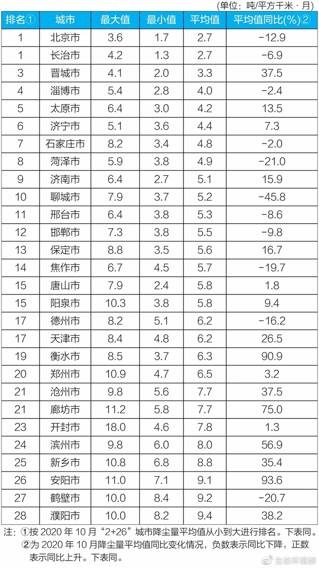 生態(tài)環(huán)境部今日向媒體公布了2020年10月京津冀大氣污染傳輸通道“2+26”城市(以下簡(jiǎn)稱“2+26”城市)和汾渭平原11城市降塵監(jiān)測(cè)結(jié)果。 “2+26”城市 10月,“2+26”城市降塵量均值范圍在2....