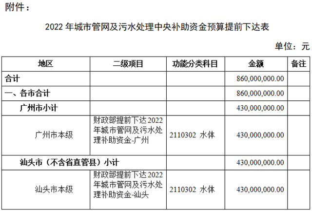 廣東省財政廳關(guān)于提前下達(dá)2022年中央城市管網(wǎng)及污水處理補助資金的通知粵財建〔2021〕54號廣州市、汕頭市財政局: 根據(jù)《財政部關(guān)于提前下達(dá)2022年城市管網(wǎng)及污水處理補助資金預(yù)算的通知》(財建〔2021〕338號),現(xiàn)將2022年中央城市管網(wǎng)及污水處理補助資金預(yù)算資金提前轉(zhuǎn)下達(dá)給你們(具體金額詳...