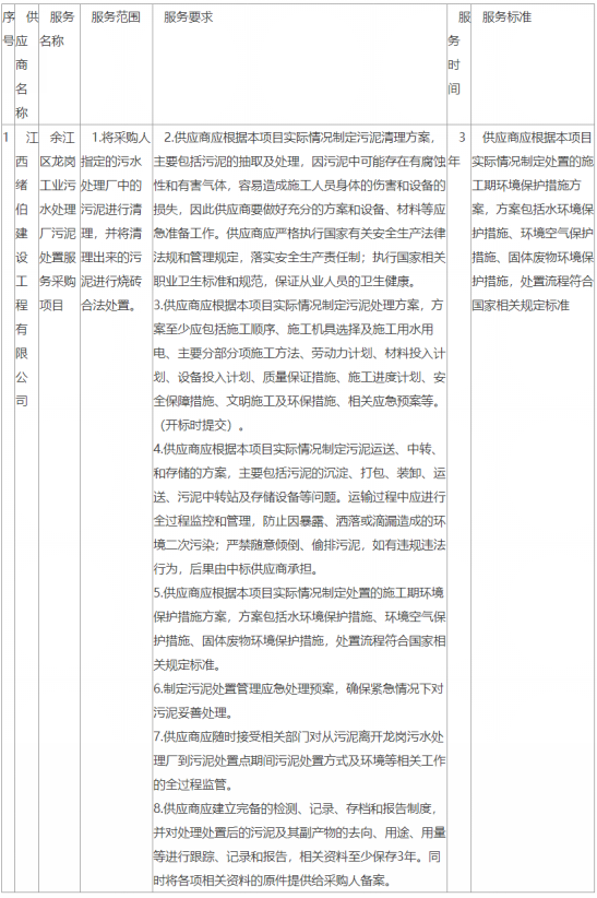 一、項(xiàng)目編號(hào):JXHD-2021-YT011(招標(biāo)文件編號(hào):JXHD-2021-011) 二、項(xiàng)目名稱:余江區(qū)龍崗工業(yè)污水處理廠污泥處置服務(wù)采購(gòu)項(xiàng)目 三、中標(biāo)(成交)信息 供應(yīng)商名稱:江西緒伯建設(shè)工程有限公司 供應(yīng)商地址:江西省南昌市灣里區(qū)國(guó)家森林公園 中標(biāo)(成交)金額:109.5000000(萬(wàn)元...