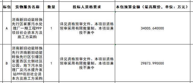 近日,中國(guó)政府采購(gòu)網(wǎng)發(fā)布山東省濟(jì)南市先行區(qū)污水處理廠PPP項(xiàng)目社會(huì)資本方及施工方采購(gòu)資格預(yù)審公告,采購(gòu)項(xiàng)目共2個(gè),A標(biāo)包為濟(jì)南新舊動(dòng)能轉(zhuǎn)換先行區(qū)崔寨污水處理廠一期工程PPP項(xiàng)目社會(huì)資本方及施工方采購(gòu),預(yù)算金額34005.64萬(wàn)元,B標(biāo)包為濟(jì)南新舊動(dòng)能轉(zhuǎn)換先行濟(jì)南新舊動(dòng)能轉(zhuǎn)換先行區(qū)引爆區(qū)安置西區(qū)北側(cè)社...