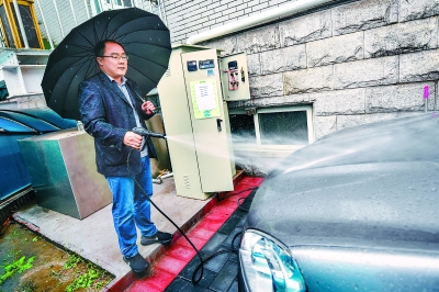 昨天下午,在北京市水科學(xué)技術(shù)研究院院內(nèi),研究人員正在演示自助的使用。(鄧偉攝)收集屋頂雨水,經(jīng)過(guò)凈化后暫時(shí)儲(chǔ)存,并利用太陽(yáng)能帶動(dòng)水泵洗車。這是由北京市水科學(xué)技術(shù)研究院自主研發(fā)的一項(xiàng)“黑科技”——自助雨水洗車機(jī)。目前,已有多臺(tái)設(shè)備在本市學(xué)校、醫(yī)院試點(diǎn)安裝。昨天秋雨綿綿,記者來(lái)到位于車公莊西路的北京市水...