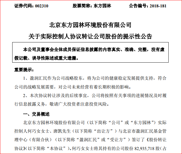 12月9日,東方園林發(fā)布公告,公司實際控制人何巧女、唐凱與北京市盈潤匯民基金管理中心(簡稱“盈潤匯民”)簽訂了《股份轉讓協(xié)議》。 根據(jù)協(xié)議,何巧女將其持有的公司股份 82,935,718 股(占公司總股本的 3.09%)、唐凱將其持有的公司股份 51,337,383 股(占公...