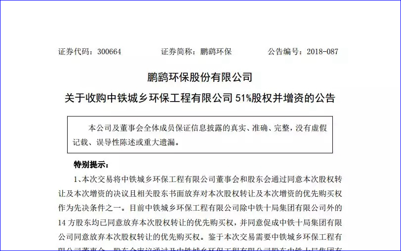 11月19日,鵬鷂環(huán)保股份有限公司開(kāi)了第二屆董事會(huì)第十八次會(huì)議,審議通過(guò)了《關(guān)于收購(gòu)中鐵城鄉(xiāng)環(huán)保工程有限公司51%股權(quán)并增資的議案》,同意公司收購(gòu)中鐵城鄉(xiāng)環(huán)保工程有限公司(以下簡(jiǎn)稱(chēng)“中鐵環(huán)保”或“標(biāo)的公司”)51%股權(quán)并對(duì)其進(jìn)行增資,其中股權(quán)轉(zhuǎn)讓價(jià)款4...