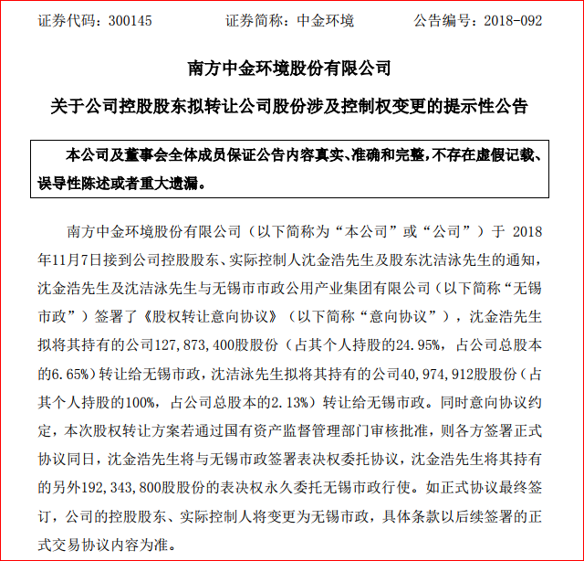 中金環(huán)境公告,公司控股股東、實(shí)際控制人沈金浩及股東沈潔泳與無(wú)錫市市政公用產(chǎn)業(yè)集團(tuán)有限公司(以下簡(jiǎn)稱(chēng)“無(wú)錫市政”)簽署《股權(quán)轉(zhuǎn)讓意向協(xié)議》。 沈金浩擬將其持有的公司127,873,400股股份(占其個(gè)人持股的24.95%,占公司總股本的6.65%)轉(zhuǎn)讓給無(wú)錫市政,沈潔泳擬將其持...