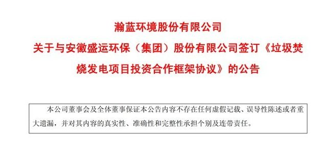 中國環(huán)聯(lián)網(wǎng)獲悉,瀚藍環(huán)境公告稱,擬與盛運環(huán)保簽訂《垃圾焚燒發(fā)電項目投資合作框架協(xié)議》,就盛運環(huán)保旗下垃圾焚燒發(fā)電項目進行投資合作。中國環(huán)聯(lián)網(wǎng)獲悉,6月6日,瀚藍環(huán)境股份有限公司(以下簡稱“瀚藍環(huán)境”)發(fā)布公告稱,公司擬與安徽盛運環(huán)保(集團)股份有限公司(以下簡稱“盛運環(huán)?!?簽訂《垃圾焚燒發(fā)電項目投...